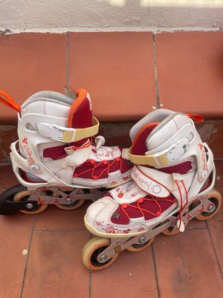 Se venden patines en línea Oxelo en color blanco y rojo, ideales para disfrutar del patinaje. - Diseño con detalles florales - Color blanco y rosa - Casi nuevos, usados 2/3 veces - Cierre con cordones y correa - Talla 38
