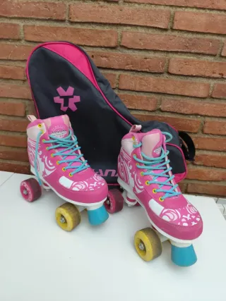 Set de patines Park city en color rosa, ideales para iniciarse en el patinaje. Incluye Bolsa de transports. En muy buen estado - Talla 35-36 - Diseño llamativo en color rosa con detalles blancos. - Cordones de color azul. - Ruedas de diferentes colores: amarillas, rojas y azules.