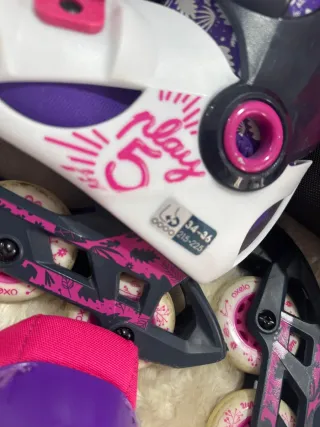 Patines en línea de color rosa y morado, diseñados para niñas. - Diseño con detalles de mariposas y texto Play. - Cierre de velcro y hebilla para un ajuste seguro. - Ruedas blancas.