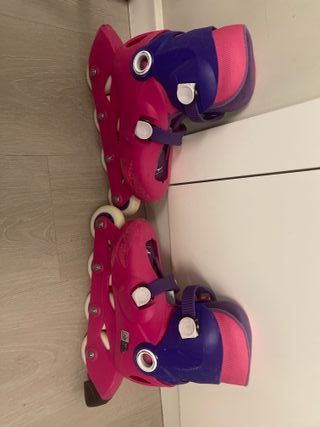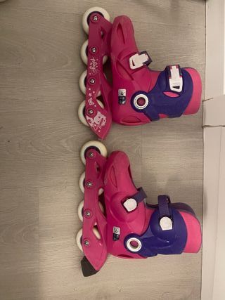 Patines en línea infantiles en buen estado. Presentan un diseño con detalles en rosa y azul. - talla 29 a 32EU (extendibles) -Cierre con velcro y hebilla. - Ruedas de poliuretano.
