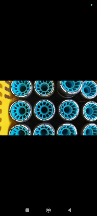 Juego de ruedas para patines de hockey. - Llanta de color azul. - Goma de color negro. Especiales para niños o suelos resbaladizos