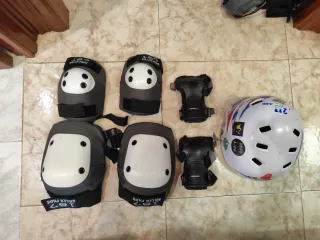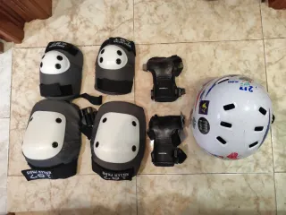 Set de protecciones para skate o patines marca 187 killer pads T(L)+ muñequera powerslide T,(L) + casco oxelo T(L) negocible. - Casco blanco con diseño. - Rodilleras y coderas marca 187 Killer Pads. - Muñequeras powerslide