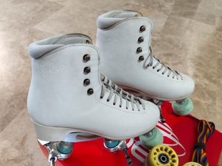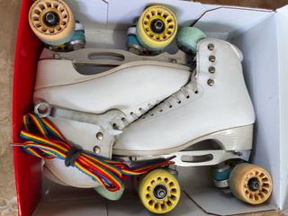 Patines artísticos de color blanco, perfectos para patinaje. - Diseño clásico. - Cordones blancos. - Ruedas de diferentes colores.