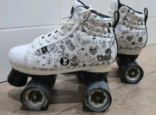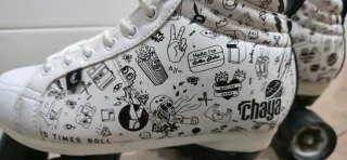 Patines Chaya con un diseño único de bocetos. - Diseño blanco con dibujos en negro. - Cordones blancos. - Ruedas negras. Talla 37