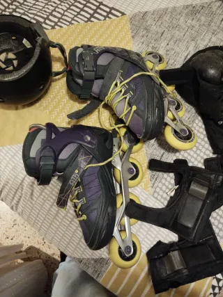 Set completo de patines en línea y equipo de protección, ideal para disfrutar de forma segura. - Incluye patines en línea. - Juego de protecciones para rodillas, codos y muñecas. - Bolsa de transporte incluida.
