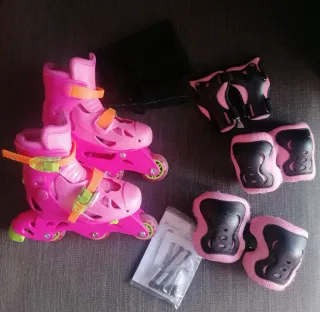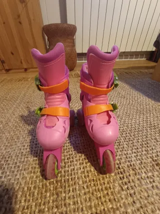 Set de patines ajustables 2 en 1 de la marca Juguettos. Tienen dos meses de uso, con señales de algún rasguño. Ideales para iniciarse en el patinaje. Incluye protecciones para mayor seguridad. - Patines de color rosa con detalles en naranja y verde. Talla ajustable del 29-32. Se pueden poner en linea o con dos ruedas detrás, como se muestra en la última foto. - Incluye rodilleras y coderas, talla S - Bolsa de transporte negra.