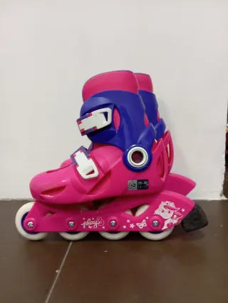 Patines en línea de color rosa y azul, diseñados para niñas. Tienen un diseño divertido con mariposas y personajes. - Talla ajustable 28-30. - Cierre de velcro y hebilla.