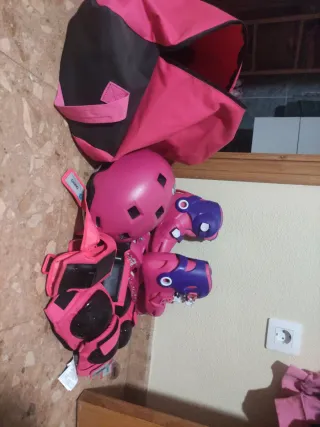 Conjunto de patines y equipo de protección para niños en color rosa. - Patines ajustables. - Casco protector. - Rodilleras y coderas. - Bolso de transporte.