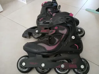 Se venden patines marca Oxelo modelo Play 3 de color rosa y morado, regulables en tallas 30 a 32. Perfectos para iniciarse en el patinaje, con cierres regulables y freno. Usados menos de 3-4 meses, se puede ver que el desgaste en las ruedas que es mínimo. Tienen rayones normales del uso. Rodamientos adaptados para ayudar a perder el miedo y no coger mucha velocidad. Muchas gracias.