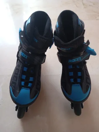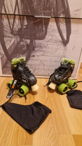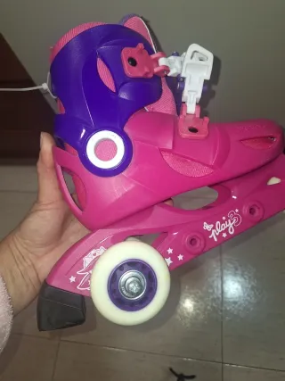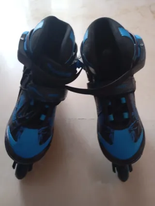 Ajustables las talla de 25 a 28. Tienen señales de uso pero se pueden aprovechar perfectamente para aprender. Se pueden poner en línea o a tres ruedas. No tienen mucho uso