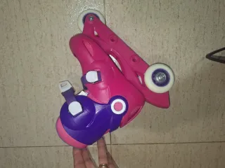 Patines en línea ajustables para tallas de 30 a 33. Perfectos para iniciarse en el patinaje. - Diseño en color morado, verde y rosa. - Ruedas resistentes para un deslizamiento suave. - Con marcas de uso pero en buen estado