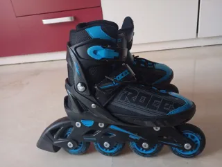 Patines en línea Roces con diseño moderno en negro y azul. Perfectos para iniciarse o para patinadores que buscan comodidad. - Talla ajustable de 34 a 37. - Cierre de velcro y hebilla para un ajuste seguro. - Ruedas de poliuretano para un deslizamiento suave. - Bota interior acolchada para mayor confort.