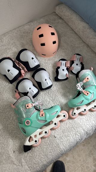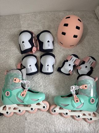 Conjunto completo para patinaje, ideal para iniciarse de forma segura. Incluye patines y protecciones. - Patines en línea color verde menta y blanco. - Casco protector color rosa pálido. - Juego de rodilleras, coderas y muñequeras.