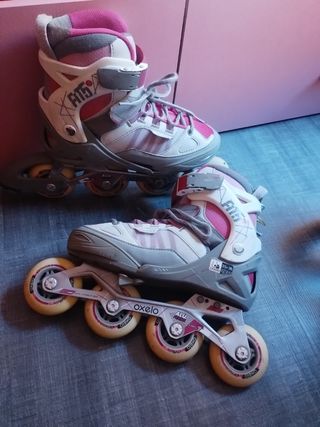 Patines de línea, con poco uso,marca Oxelo. ajustables con talla desde la 32 hasta la 34 aunque da como para un 35... Muy fáciles de poner y cómodos.