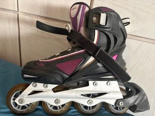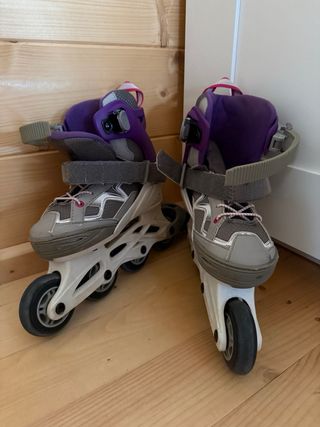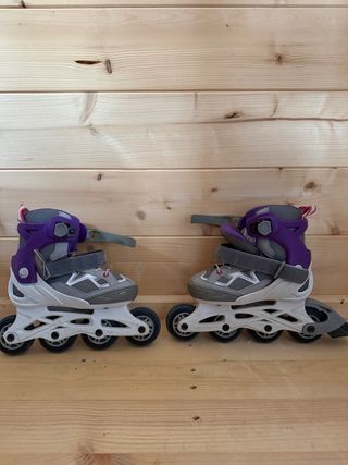 Se venden patines en línea en buen estado, ideales para disfrutar del patinaje. - Diseño en color morado y gris. - Cierre de velcro y hebilla para un ajuste seguro. - Ruedas resistentes para un deslizamiento suave.