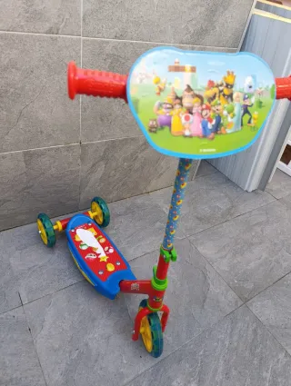 Patín de tres ruedas con diseño de Super Mario. - Manillar con estampado de personajes de Super Mario. - Puños de goma rojos. - Base antideslizante con diseño. - Ruedas de plástico.