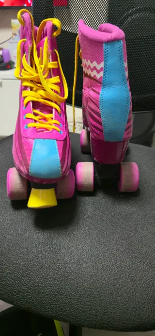 Estos patines son perfectos para deslizarte con estilo. Su diseño vibrante los hace destacar. - Color rosa llamativo con detalles en azul. - Cordones amarillos brillantes. - Ruedas resistentes para patinaje con muy poco uso . -patines en linea negros, en muy buen estado 25 x und