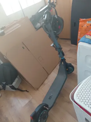 Patín eléctrico de color negro, ideal para desplazamientos urbanos. Cuenta con un diseño moderno y funcional. - Manillar ajustable. - Ruedas con detalles azules. Cargador, libro y factura