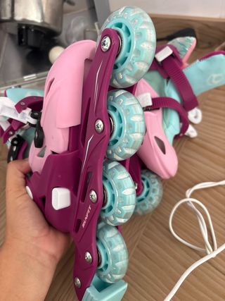 Patines en línea de color rosa, azul y morado, ideales para niños. - Diseño ajustable para adaptarse al crecimiento. - Ruedas de color azul translúcido. - Cierres de velcro y hebilla para un ajuste seguro. - Detalle de estampado floral en la parte superior.