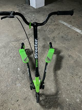 Patín de tres ruedas de la marca SUPER STREETER. - Diseño en color verde y negro. - Manillar curvo. - Plataformas para los pies. - Usado 1 vez