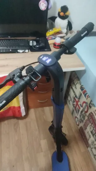 Patín eléctrico de la marca Reebok en color azul. Diseñado para desplazamientos urbanos. - Manillar con puños ergonómicos. - Pantalla digital integrada en el manillar. - Freno de mano. - Logo de Reebok visible en el manillar.
