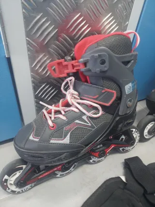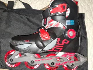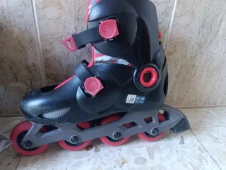 Se venden patines en línea en color negro con detalles en rojo. Son ideales para disfrutar de paseos y practicar patinaje. Número del 31 al 37, ajustables - Diseño deportivo. - Cierre de seguridad. - Ruedas de color rojo.