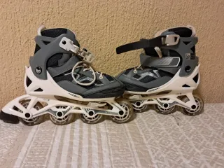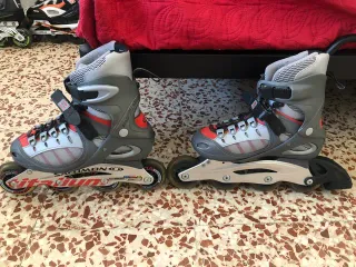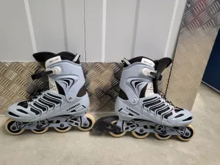 Se venden patines en línea Firefly en color gris y negro. Son cómodos y seguros para patinar. - Talla ajustable. - Cierre de velcro y hebilla. - Ruedas ABEC.