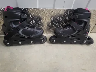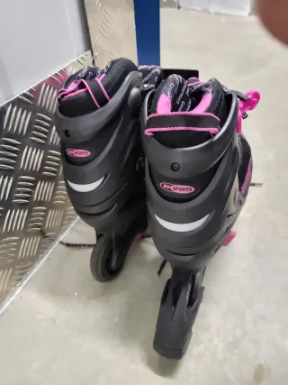 Juego de patines en línea extensibles, ideales para aprender y progresar. Incluye protecciones para mayor seguridad. -Mochila transporte. - Talla extensible de 35 a 38. - Diseño en negro y rosa. - Cierre de velcro y hebilla. - Incluye rodilleras, coderas y muñequeras.
