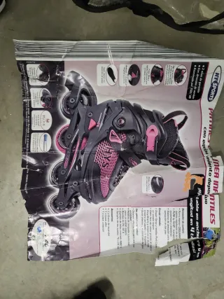 Los compré para patinar con mi hija pero no hay manera. Usados en dos ocasiones están nuevos. Talla 41. Set de patines en línea Fila en color negro y rosa, talla M. Incluye protecciones. - Patines Fila con ruedas blancas. - Cierre de velcro y hebilla. - Incluye bolsa de red con protecciones (rodilleras y coderas). - Marca: Fila