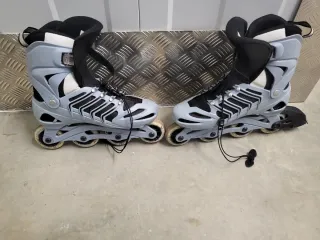 Se venden patines en línea Oxelo, ideales para iniciarse en el patinaje. - Color gris y blanco. - Cierre con cordones, velcro y hebilla. - Ruedas de 76 mm.