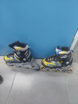Patines en línea de la marca Magical, ideales para deslizarse y divertirse. Talla 35 a 38 - Diseño en color amarillo, negro y azul. - Ruedas de patinaje en línea. - protecciones negras y naranjas