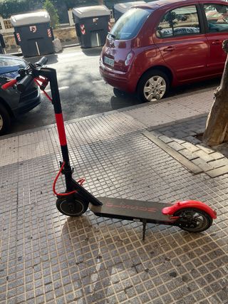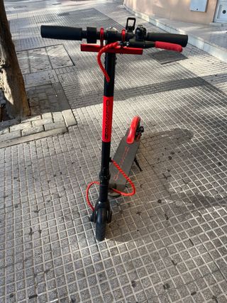 Patín eléctrico Olsson Arrow en color negro y rojo. - Diseño moderno y deportivo. - Ruedas resistentes. - Manillar ajustable. - Lo único que le falla es el freno de atrás porque están gastadas las pastillas lo demás todo perfecto.