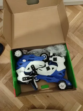 Set de patines ajustables en talla de la 34 a la 37. Incluye: - Patines ajustables. - 2 Bolsas de transporte. - Juego de protecciones (rodilleras, coderas y muñequeras). - Dos cascos