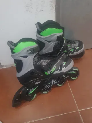 Patines en línea de color negro y verde, ajustables para tallas 41 a 44. Diseñados para ofrecer comodidad y estabilidad. - Ruedas con rodamientos ABEC-7. - Cierre de velcro y hebilla. - Diseño deportivo.
