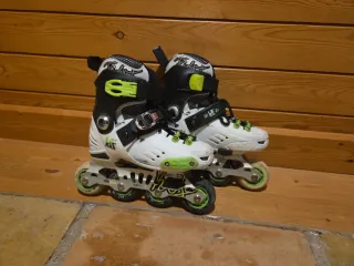 Patines en línea blancos y verdes, perfectos para aprender y divertirse. Son ajustables para adaptarse al crecimiento. - Tallas ajustables: 4 tallas. - Cierre de velcro y hebilla. - Ruedas de 70mm.