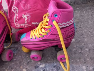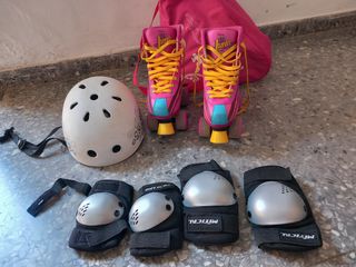 patines de 4 ruedas talla 34, mochila para guardar, rodilleras, coderas y casco en muy buen estado
