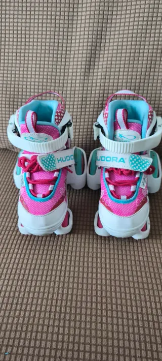 Set de patines en línea Hudora para niña, con un diseño divertido y colorido. - Color principal: rosa con detalles en blanco y azul. - Cierre de velcro y hebilla para un ajuste seguro. - Ruedas de calidad para un deslizamiento suave. -talla de la 26 a la 29