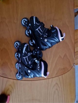 Patines ajustables para niña, ideales para aprender a patinar. El color rosa y azul los hace muy llamativos. También tengo casco nuevo talla S (52-54)el casco por 8€ - Talla ajustable de 32 a 34. - Cierre de velcro y hebilla para un ajuste seguro. - Ruedas resistentes para un deslizamiento suave.