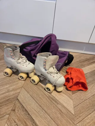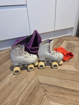 Se venden patines blancos, talla 32 Ideales para iniciarse en el patinaje. - Cierre con cordones. - Ruedas de color amarillo. - Incluye bolsa de transporte morada y calcetines naranjas.