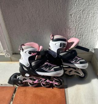 Patines infantiles con ajuste de talla. - Talla ajustable de la 32 a la 35. - Diseño en color blanco, negro y rosa. - Cierre de velcro y hebilla.