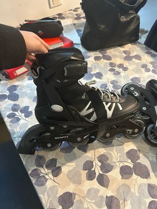Patines en línea de color negro con detalles en blanco y rojo. - Cierre de velcro y hebilla. - Ruedas de poliuretano. - Bota acolchada para mayor comodidad. Talla 41 Protecciones incluidas