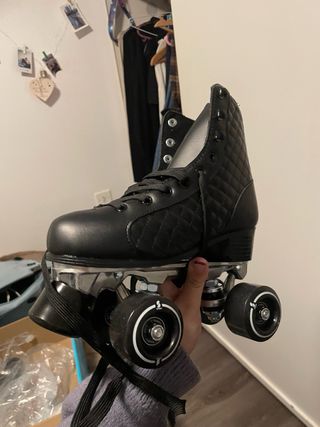 Patines de cuatro ruedas en color negro, completamente nuevos. - Diseño acolchado. - Cordones negros. - Ruedas negras.
