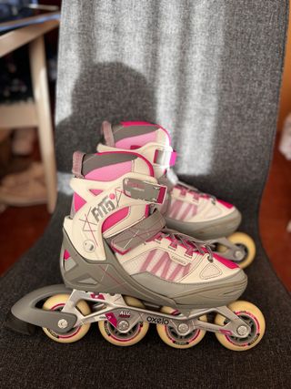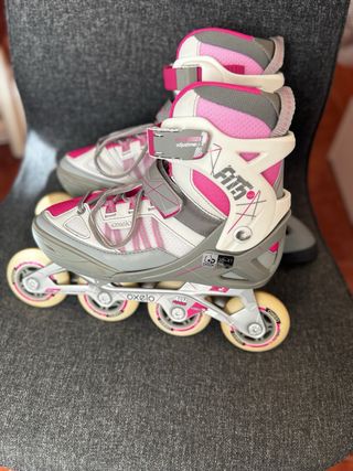 Patines en línea Oxelo con ajuste de talla. - Color blanco, rosa y gris. - Cierre de cordones, velcro y hebilla. - Ruedas Oxelo. - Incluye bolsa oxelo de transporte. - Tiene un par raspados en el lateral, pero se han usado muy poco y están en bastante buen estado.