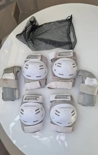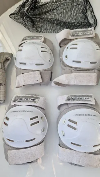 Set de protecciones para patinaje. Incluye rodilleras, coderas y muñequeras. Diseño ergonómico y cierre ajustable. Color gris y blanco. Marca Powerslide. Para edades hasta 12 o 13 años.