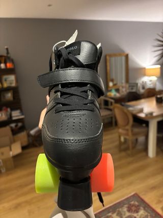 Se venden patines de 4 ruedas Oxelo en talla 40. Son nuevos y sin estrenar - Color negro. - Ruedas de colores: verde, morado, naranja y azul claro. - Cierre de velcro y cordones.
