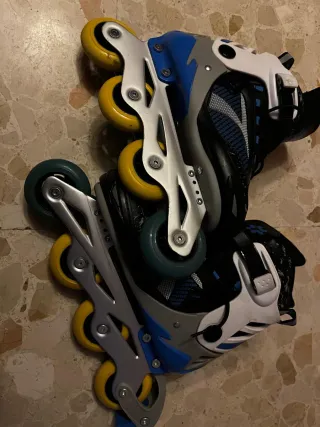 Patines en línea con diseño deportivo y ruedas de colores. - Ruedas amarillas y verdes. - Estructura de plástico y metal. - Cierre de velcro y hebilla.