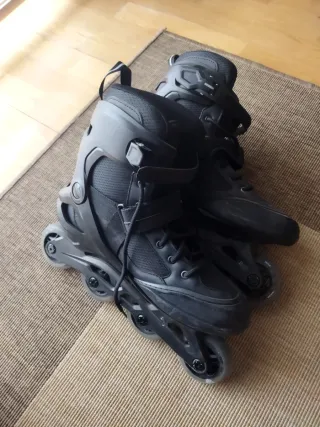 Patines en línea de color negro, ideales para patinaje. - Diseño moderno y funcional. - Cierre de velcro y cordones para un ajuste seguro. - Ruedas resistentes para un deslizamiento suave.
