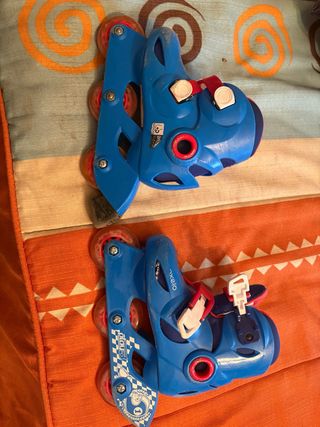 Patines en línea de color azul y rojo para niños. - Talla ajustable 30-32. - Cierre de velcro y hebilla. - Ruedas rojas. Precio no negociable