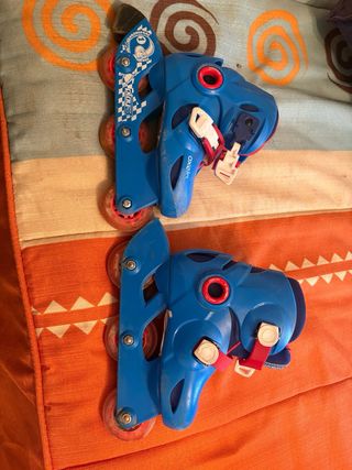 Patines en línea Oxelo para niños, ideales para iniciarse en el patinaje. Diseñados para ofrecer comodidad y seguridad. - Color azul y rojo. - Talla ajustable 28-30 (18-19 cm). - Cierre con velcro y hebilla. - Ruedas de 63 mm. - Incluye protecciones para manos, codos, rodillas y un casco. PRECIO NEGOCIABLE !!