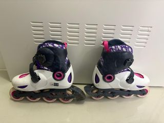 Patines en línea de la marca Oxelo, ideales para niños. - Talla ajustable de 30 a 32. - Diseño en color blanco con detalles en morado y rosa. - Cierre de velcro y hebilla para un ajuste seguro.